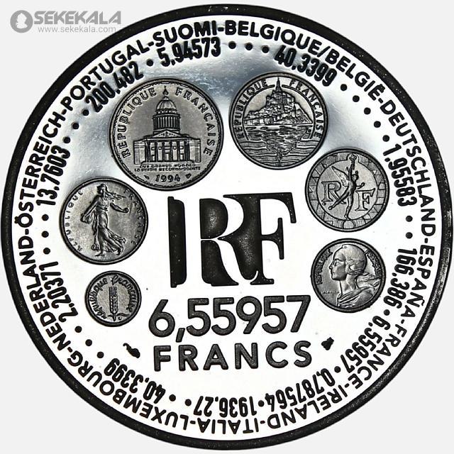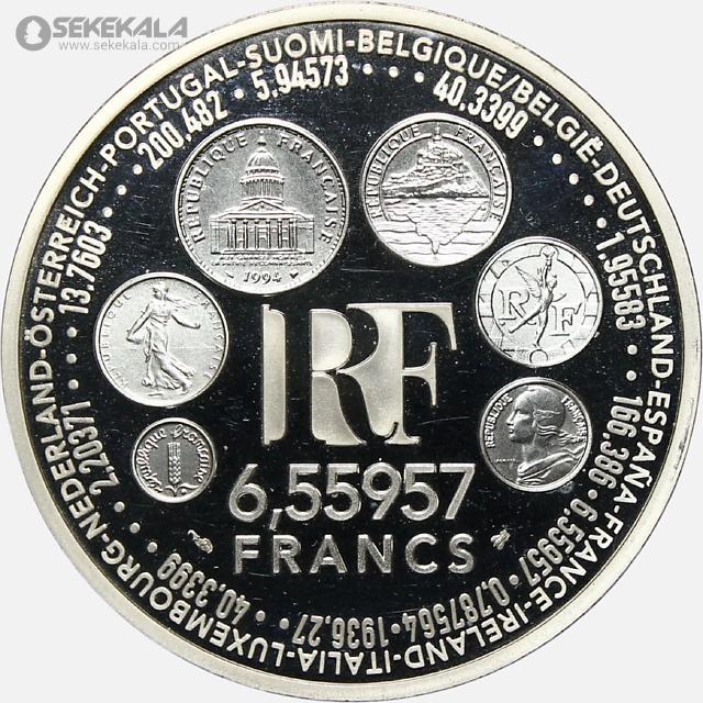 سکه یادبود فرانسه با موضوع «گذار از فرانک به یورو». در مرکز آن حروف RF (جمهوری فرانسه) و عدد 6.55957 فرانک به‌عنوان نرخ رسمی تبدیل فرانک به یورو نقش بسته است. در حاشیه سکه، نام کشورهای عضو اتحادیه اروپا همراه با نرخ‌های تبدیل ارز هر کشور به یورو درج شده و طرح‌های کوچک داخل سکه نیز نمونه‌هایی از سکه‌های مشهور فرانسه پیش از یورو را نمایش می‌دهند. این سکه یادگار یکی از مهم‌ترین تحولات پولی قرن بیستم در اروپا است و ارزش کلکسیونی بالایی دارد.