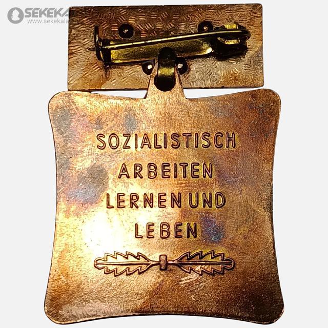 این مدال از جمهوری دموکراتیک آلمان (DDR یا آلمان شرقی) است و به عنوان نشان “قهرمان کار” (Held der Arbeit) شناخته می‌شود. این نشان به افرادی اعطا می‌شد که دستاوردهای استثنایی در زمینه کار، صنعت، یا خدمات عمومی در راستای اهداف سوسیالیستی داشته‌اند. طراحی آن شامل پرچم آلمان شرقی (با رنگ‌های سیاه، قرمز و زرد)، نماد چکش و پرگار (نمایانگر اتحاد کارگران و روشنفکران)، و شاخه گندم است که در یک زمینه قرمز با حاشیه طلایی قرار گرفته است. این مدال یک شیء کلکسیونی ارزشمند از دوران آلمان شرقی محسوب می‌شود.